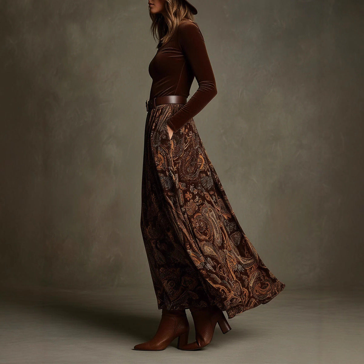 A combinação do top de manga comprida com decote quadrado e da saia maxi estampada cria um equilíbrio perfeito entre elegância e conforto. O seu estampado detalhado acrescenta personalidade e um toque artístico, enquanto o tecido de veludo adiciona maciez, corpo e um acabamento visual refinado.